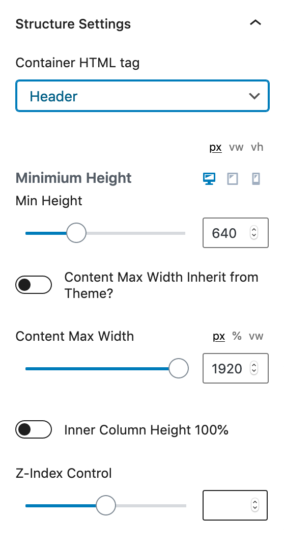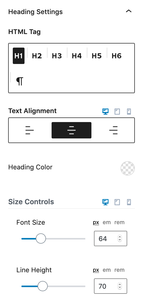 Once H1 and H4 headings, and buttons are present font size, margins and line heights can be tweaked for desktop, tablet, and mobile designs. You can preview each size and make adjustments as needed.