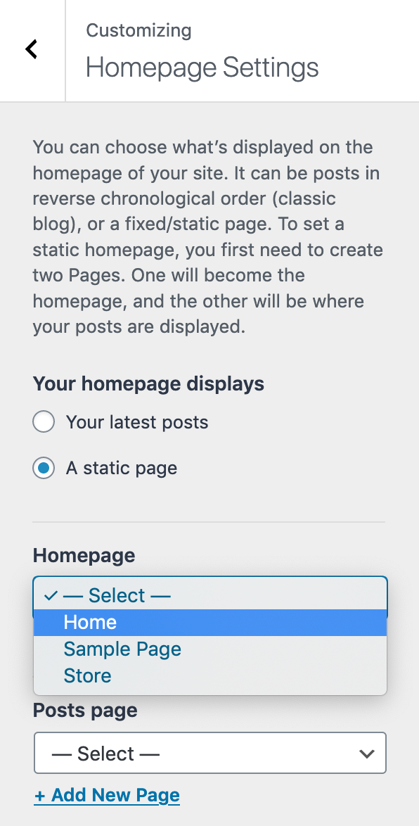 Under Appearance -> Customize -> Homepage Settings make the page we just created the home page for our site. Make sure you have published the page otherwise it won’t appear in the list.