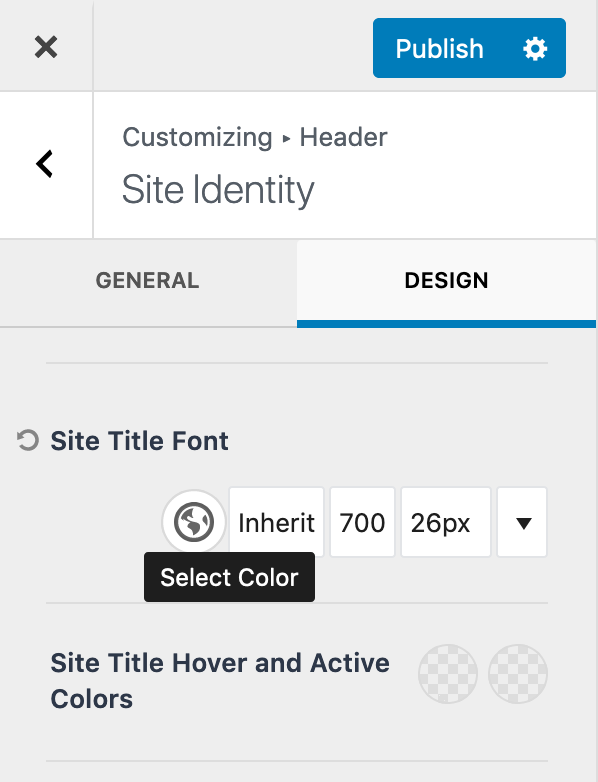 To make the text in the top navigation bar white choose Appearance from the left navigation menu and select Customize. Select the gear icon for both the Logo and Primary Navigation button, and under Design set the Site Title Font to white. Do the same for Tablet/Mobile tab.