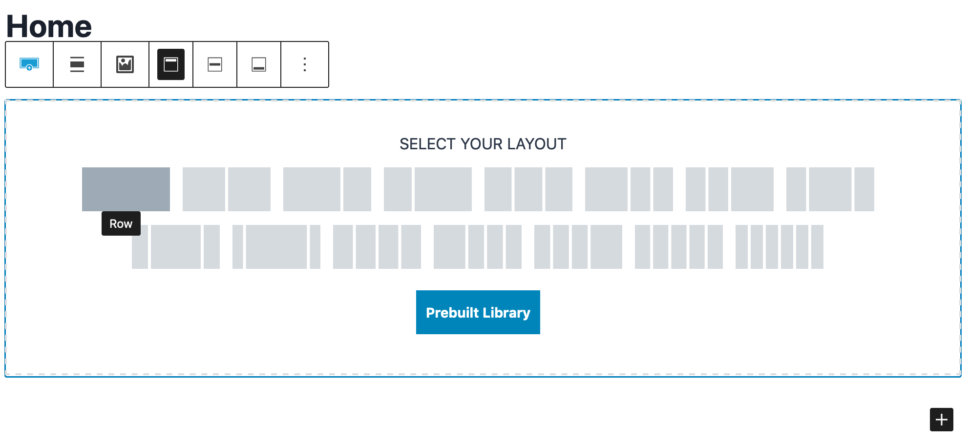 Let’s get started by first creating a home page. Go to Pages and click the Add New button. Enter Home for the page title. Click the + to add a new block and choose the Kadence Row Layout block. Select one column from the list of column options.